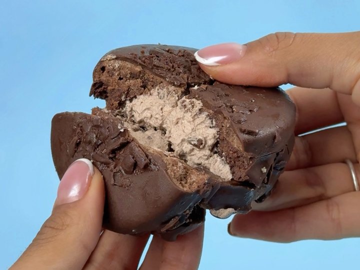 Alfajor hecho a base de harina de arroz, cacao y proteína endulzado con estevia y relleno de una crema proteica de chocolate con centro chocolatoso.