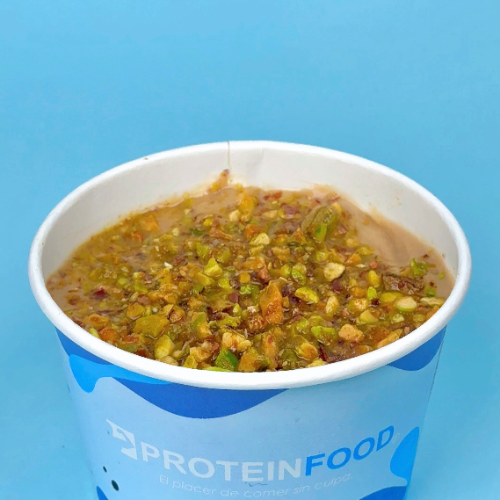 Delicioso cuchareable proteico de alfajor sin gluten, con capas de alfajor de olla sin azucar y crema proteica de pistachos endulzada con eritritol. decorado con pistachos tostados.